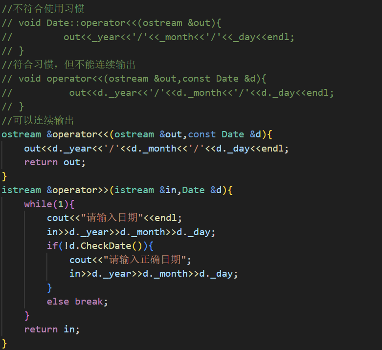 ●重载<<和>>时,需要重载为全局函数,因为重载为成员函数,this指针默认抢占了第一个形参位置,第一个形参位置时左侧运算对象,调用时就变成了对象<<cout,不符合使用习惯和可读性。重载为全局函数把ostream/istream放在第一个形参位置即可,第二个形参位置为当前类类型对象
