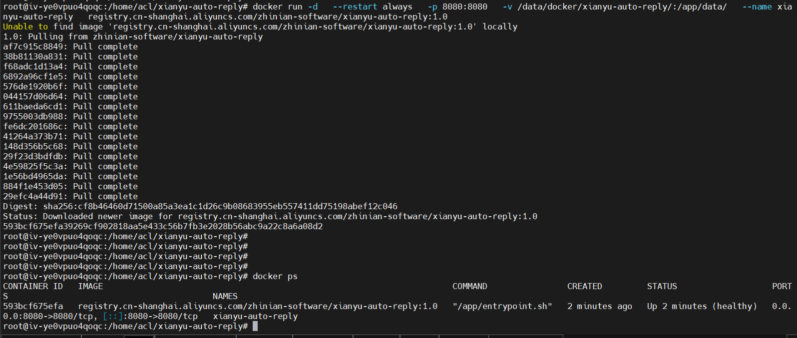 运行这个命令后,你应该能看到一个名为 xianyu-auto-reply 的容器。STATUS 列会显示 Up 时间(正在运行)或 Exited(已停止)。