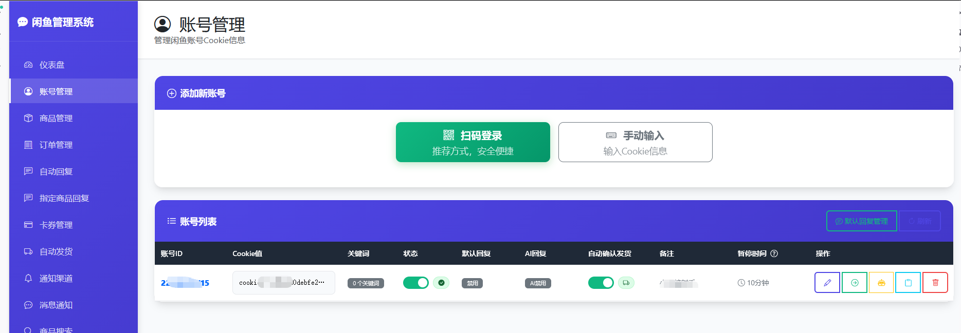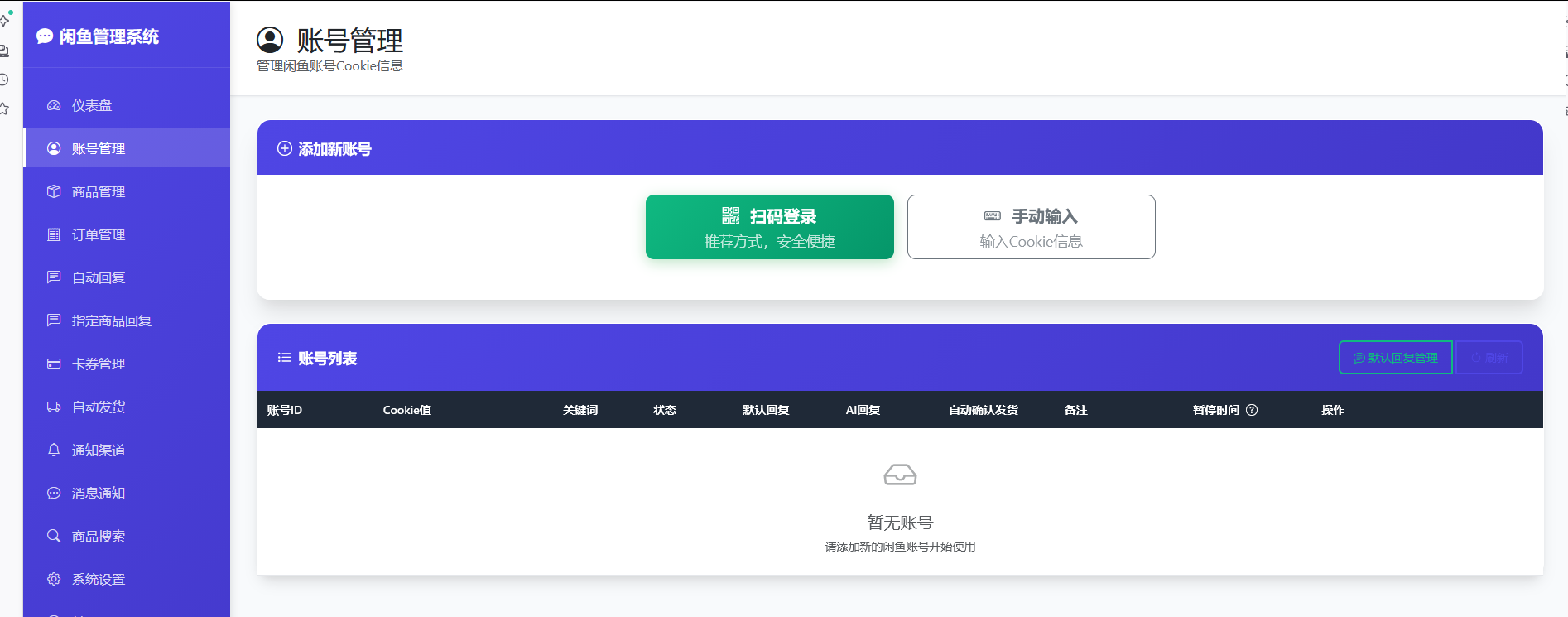 点击账号管理,添加闲鱼账号,推荐使用扫码的方式进行添加: