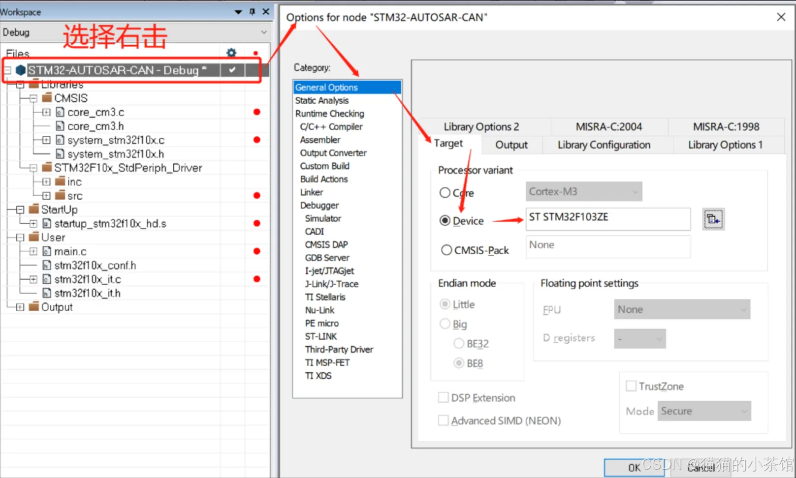 【Project】->【Options】->【General Options】->【Target】->【Device】