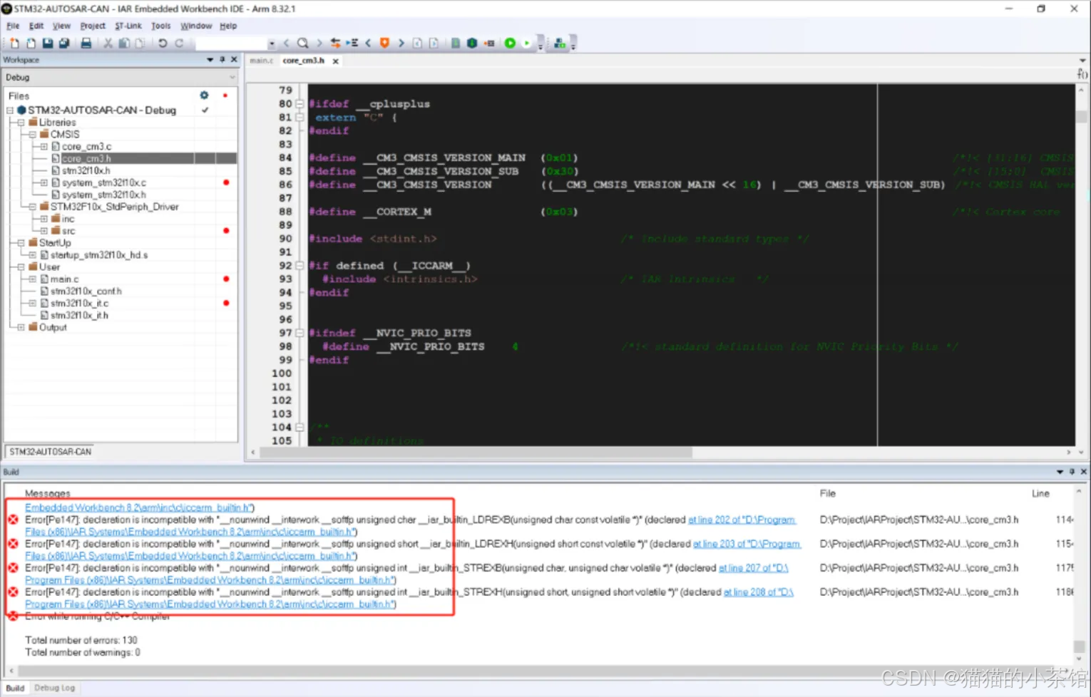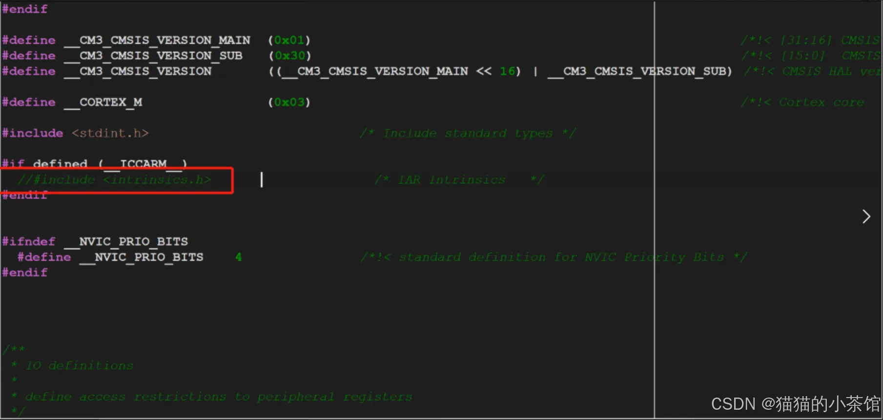 core版本和IAR提供的版本不⼀致,所以使用STM32的就好了,而且注释掉core_cm3.h93行://#include <intrinsics.h>