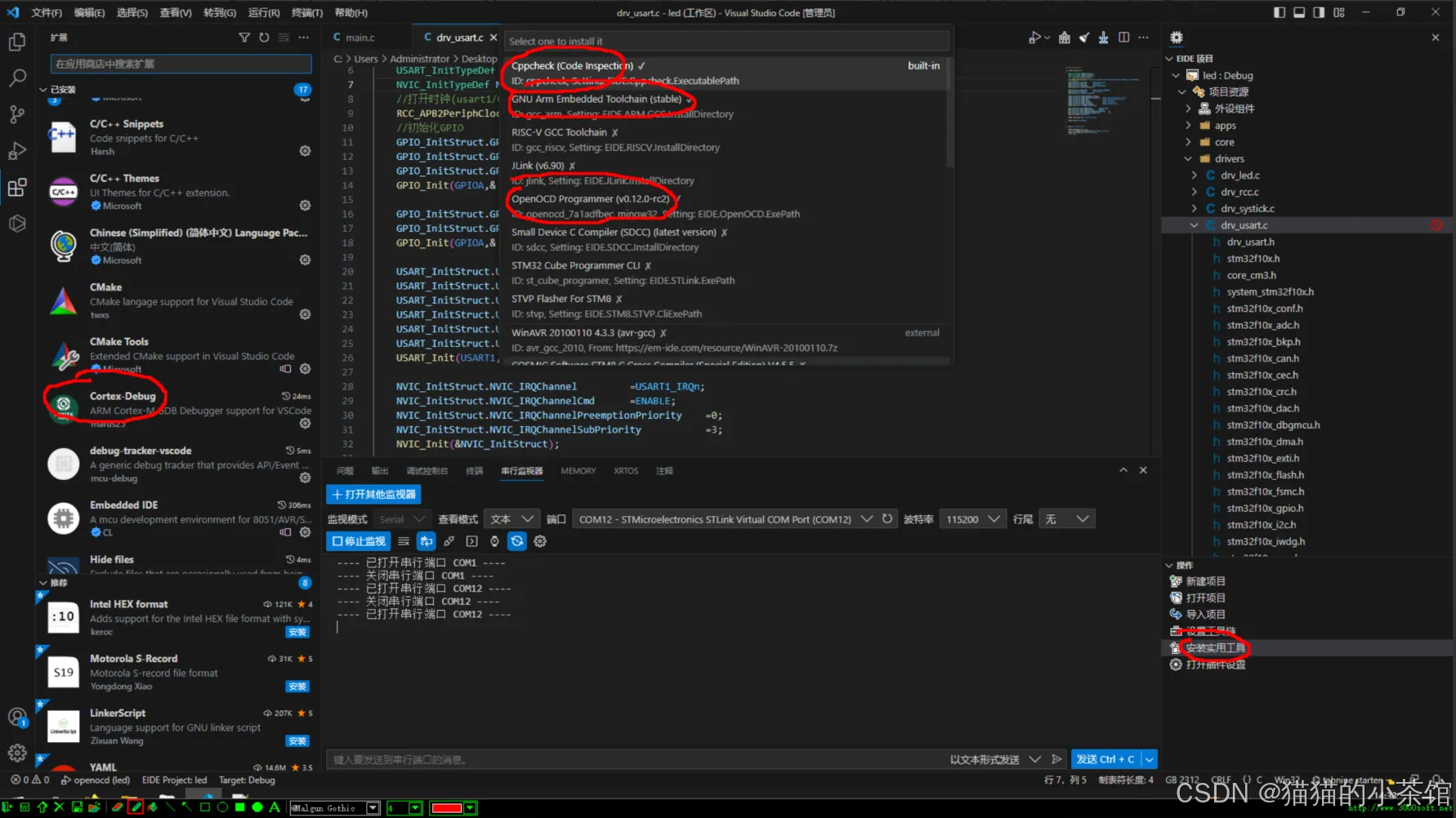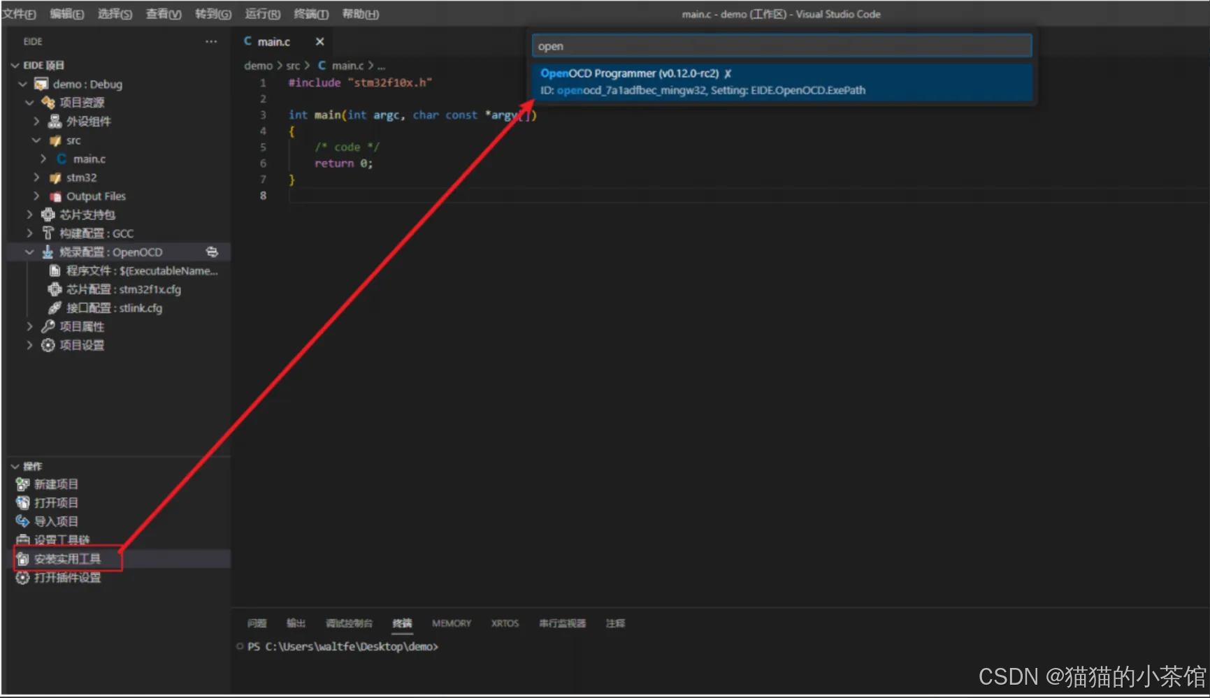 📌 注意:没装下载器驱动或烧录工具,可以直接在 '安装实用工具栏' 直接选择安装,会安装在 C:/{用户}/.eide/tools 目录下,装错了需要手动删除
