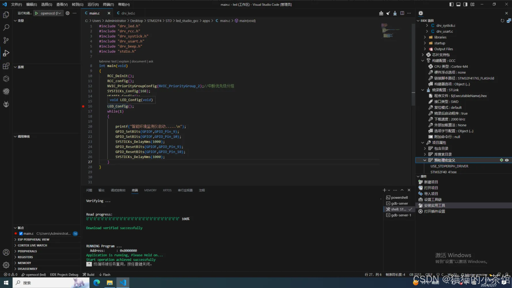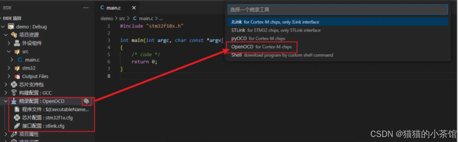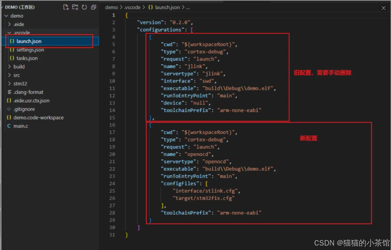 注意: 这里VSCode有⼀个小坑,在选择新的烧入配置后(默认Jlink,不改就可以不管),DEBUG时会提示错误,原因是debug配置中没将老的烧入配置移除。