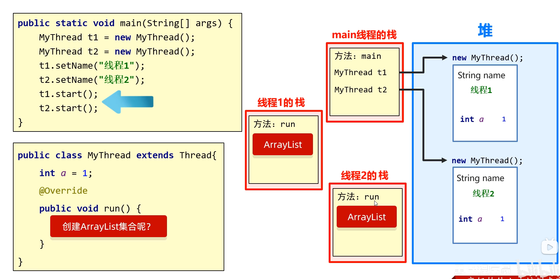 t1.start()方法一旦执行,就会给t1线程创建一个栈内存;t2也是如此