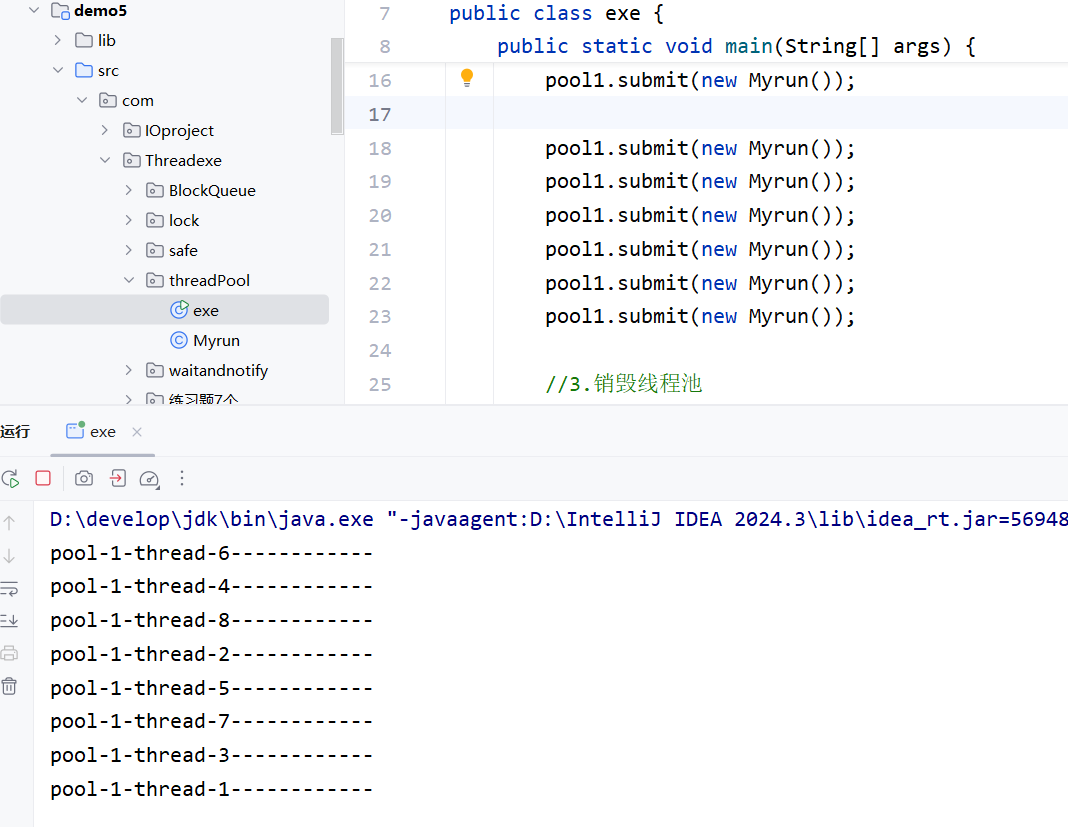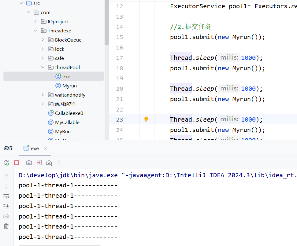 这种的依然体现不出来,因为提交任务也很快,前面的线程无法执行完立马回来完成后面提交的任务。所以我们要让任务提交得慢些,让线程1有充足的返回线程池时间,所以在后面的提交任务前面加一个sleep。