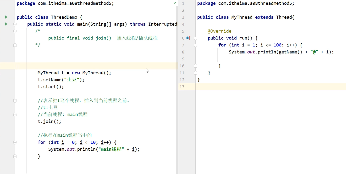 利用join方法就可以使土豆线程运行完之后再运行main线程,如果不使用join方法,土豆和main线程就会交叉执行。