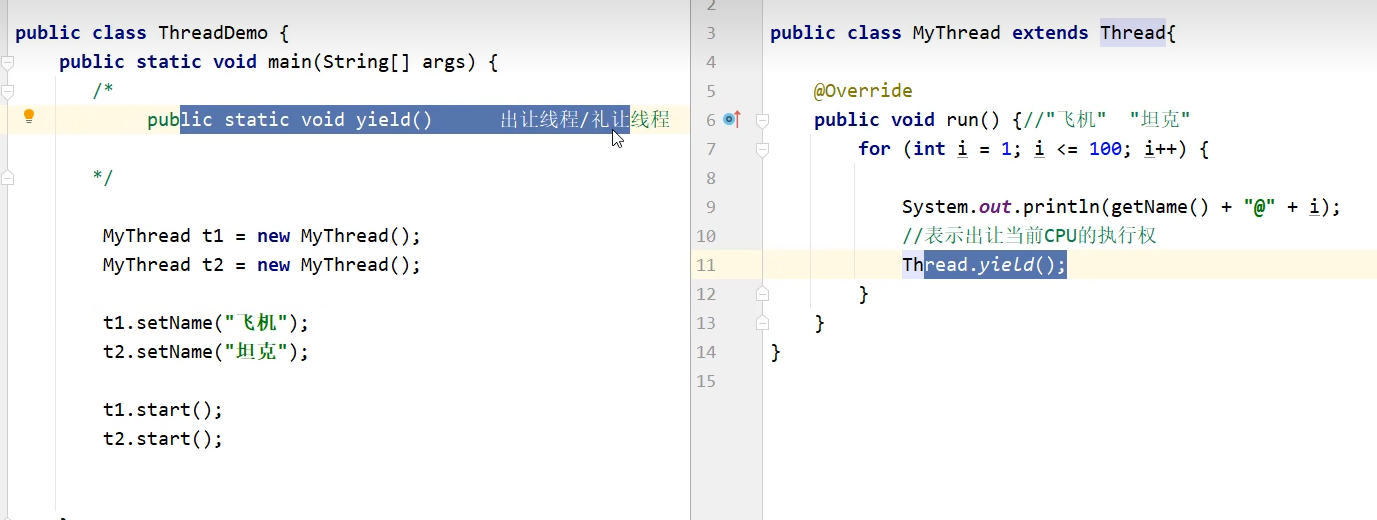 在run方法中插入Thread.yield方法,使当前正在执行的线程把CPU执行权礼让出去,这样的话,打印结果就会很均衡,但是并不是绝对的均衡,只是尽可能地均衡,因为礼让出去CPU还可能再抢回来。