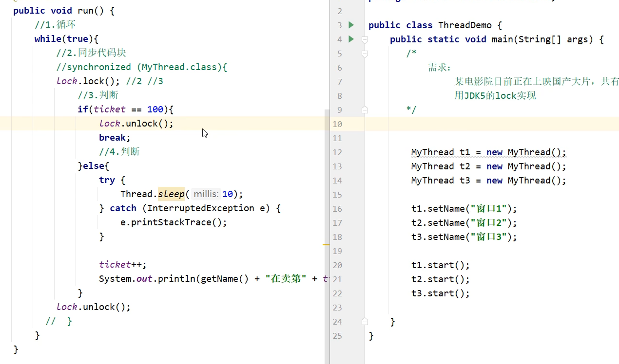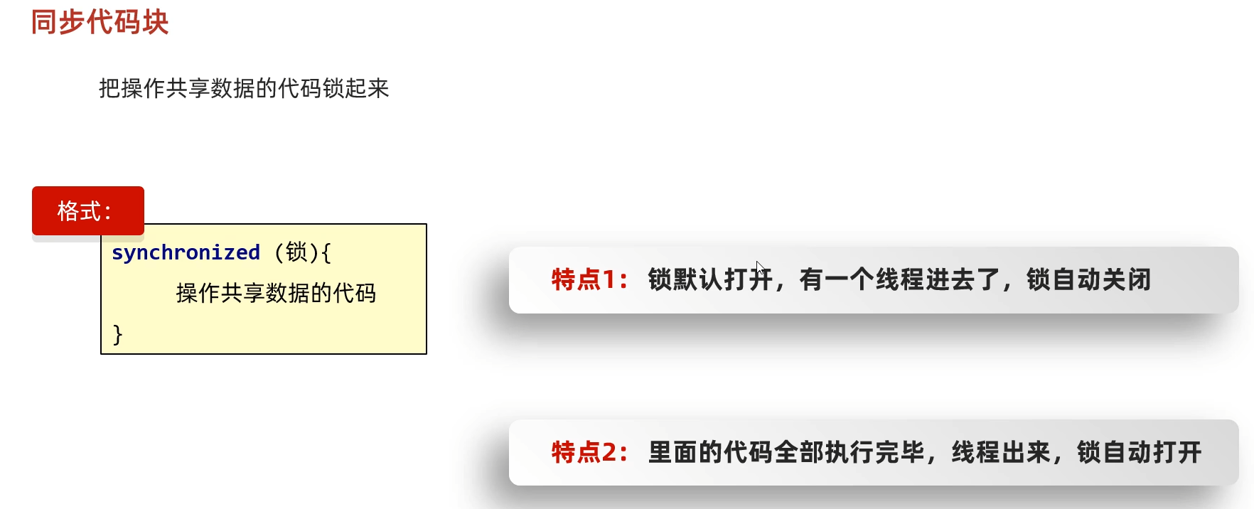 锁也是一个共享资源,但是它只有一个,一个线程使用之后,其他线程就不能使用锁了,所以就无法执行 操作共享数据ticket的代码块 ,只能在外面等着,等那个线程执行完后,会把锁释放,拿到锁的线程就可以执行了,此时,其余的线程因为没有锁就无法执行。