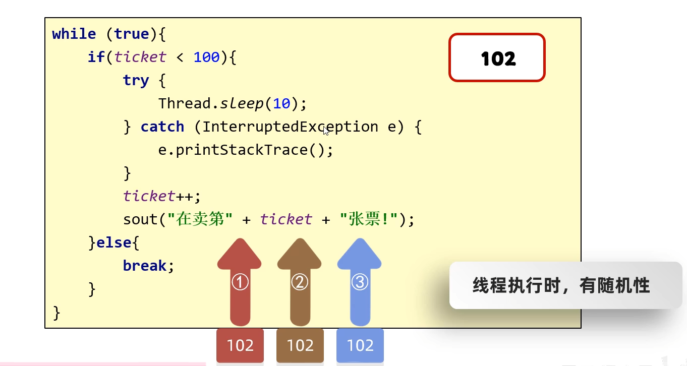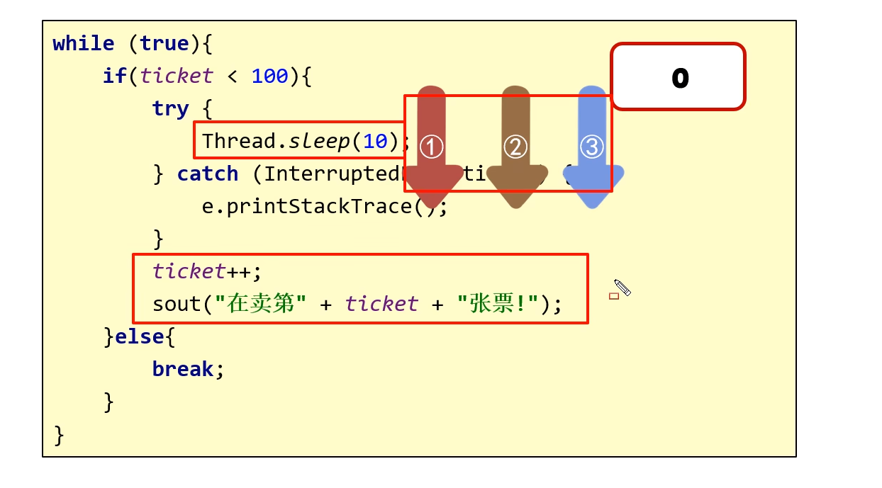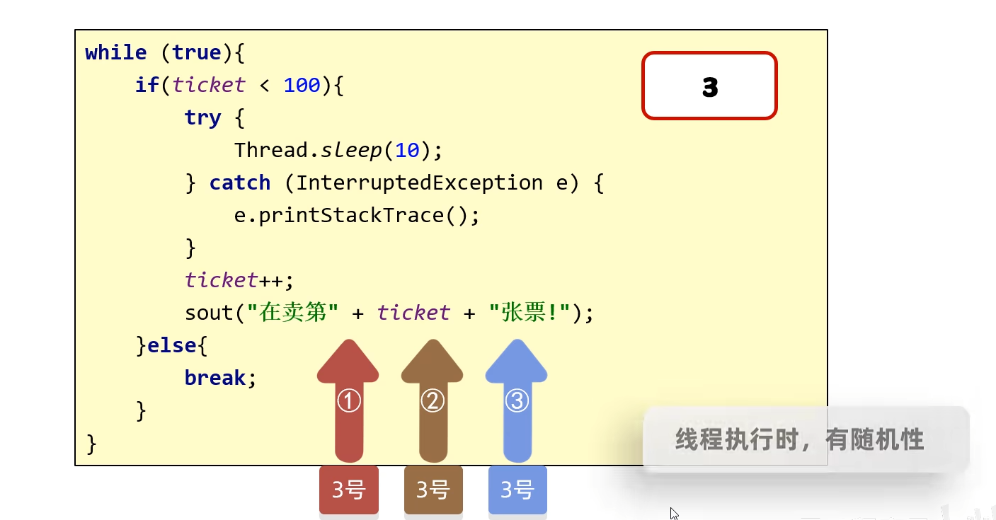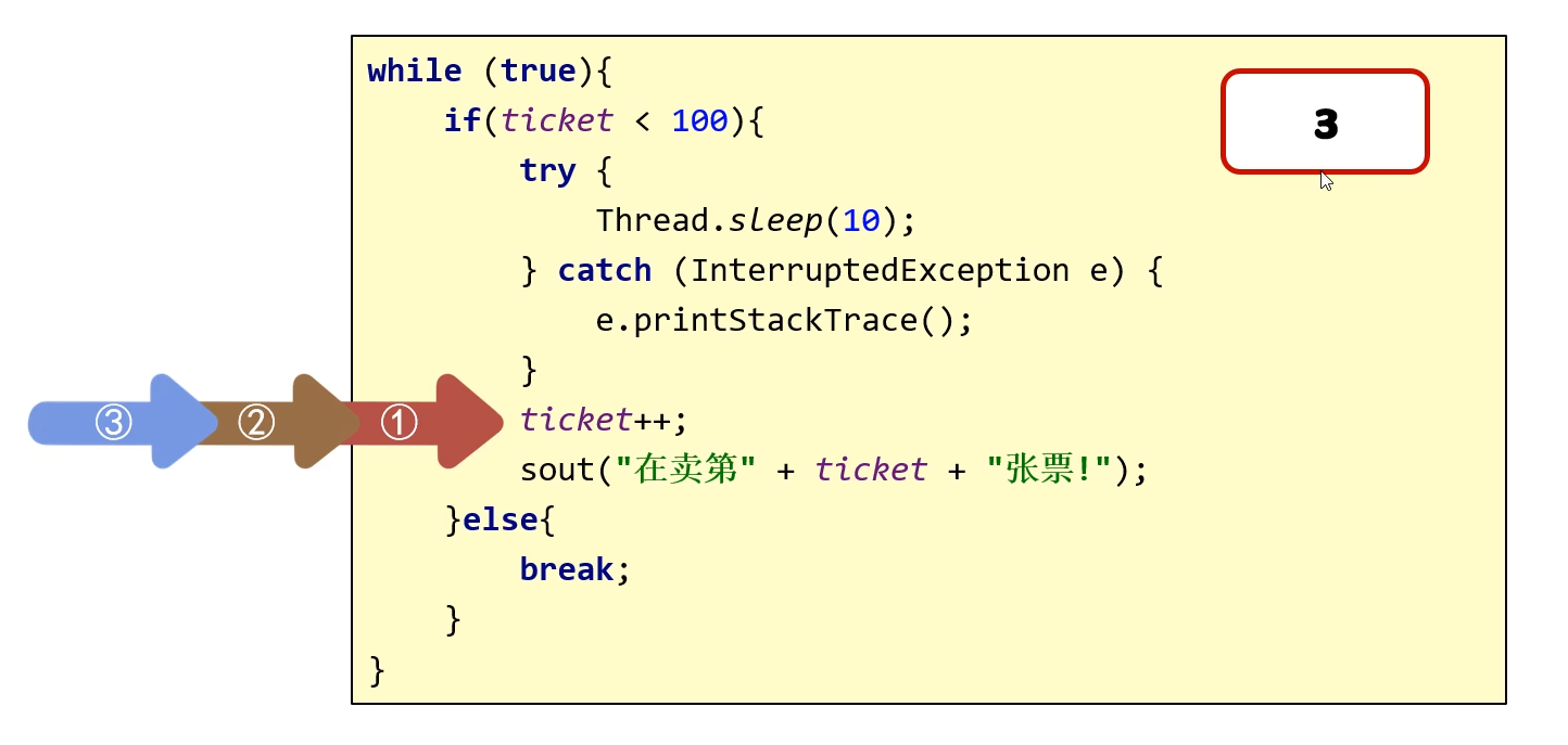 2)sleep结束后,三个窗口陆续执行ticket++操作,都还没有sout就被抢走CPU了,导致ticket=3
