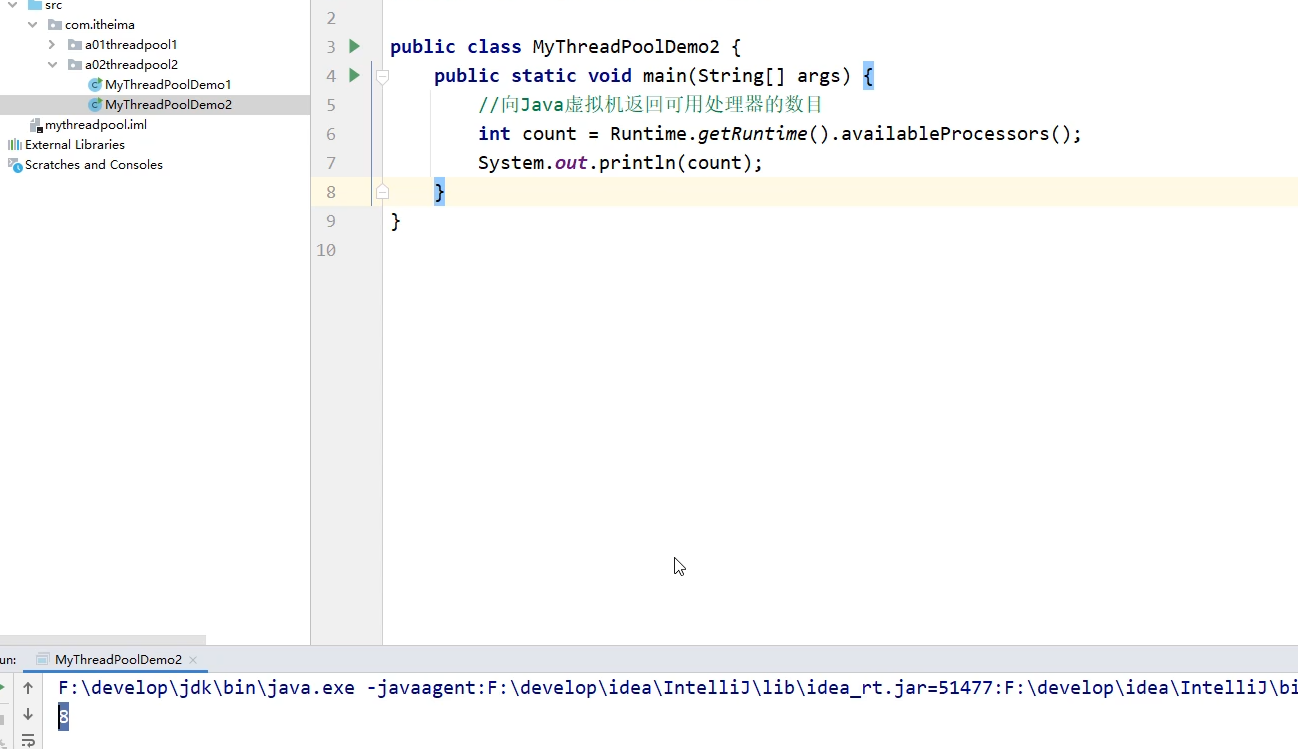 任务需要时间长,无法很快执行完就回线程池复用,所以就会创建8个线程来完成这些任务。