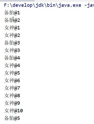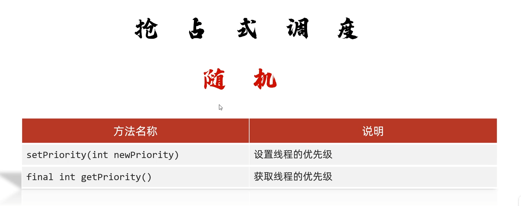 Java是抢占式调度,每个线程都可以抢占CPU得到执行权,上述的t1和t2线程就是如此,所以执行是随机的,不确定的,不知道是哪个线程就能突然抢到CPU得到执行权。