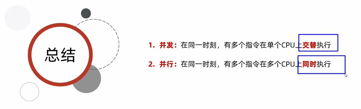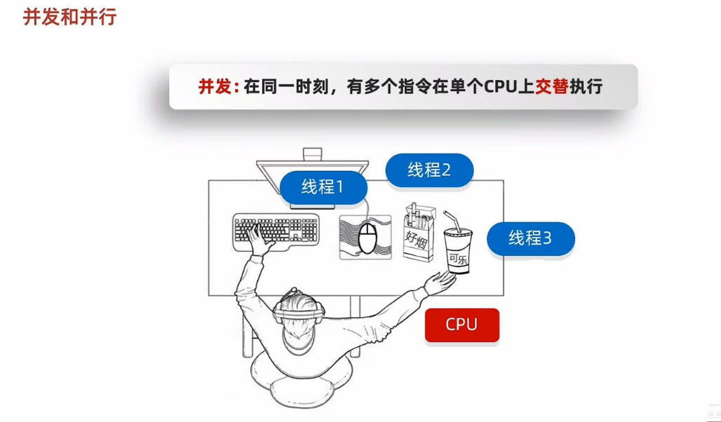 一个CPU在多个线程之间来回切换执行,因为执行速度非常快,在人所能看到的宏观层面就是同时执行这些线程的,但其实是同一时间只能执行一个线程,是交替执行的。
