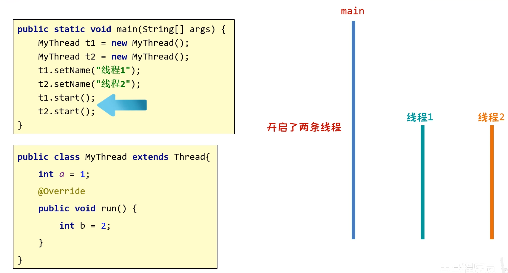 该方法,创建的类继承了Thread类,那就是线程,所以可以调用thread类的所有方法。在调用start方法之后,会调用类的run方法,此时可以标注线程的名字来区分执行的是哪个线程。