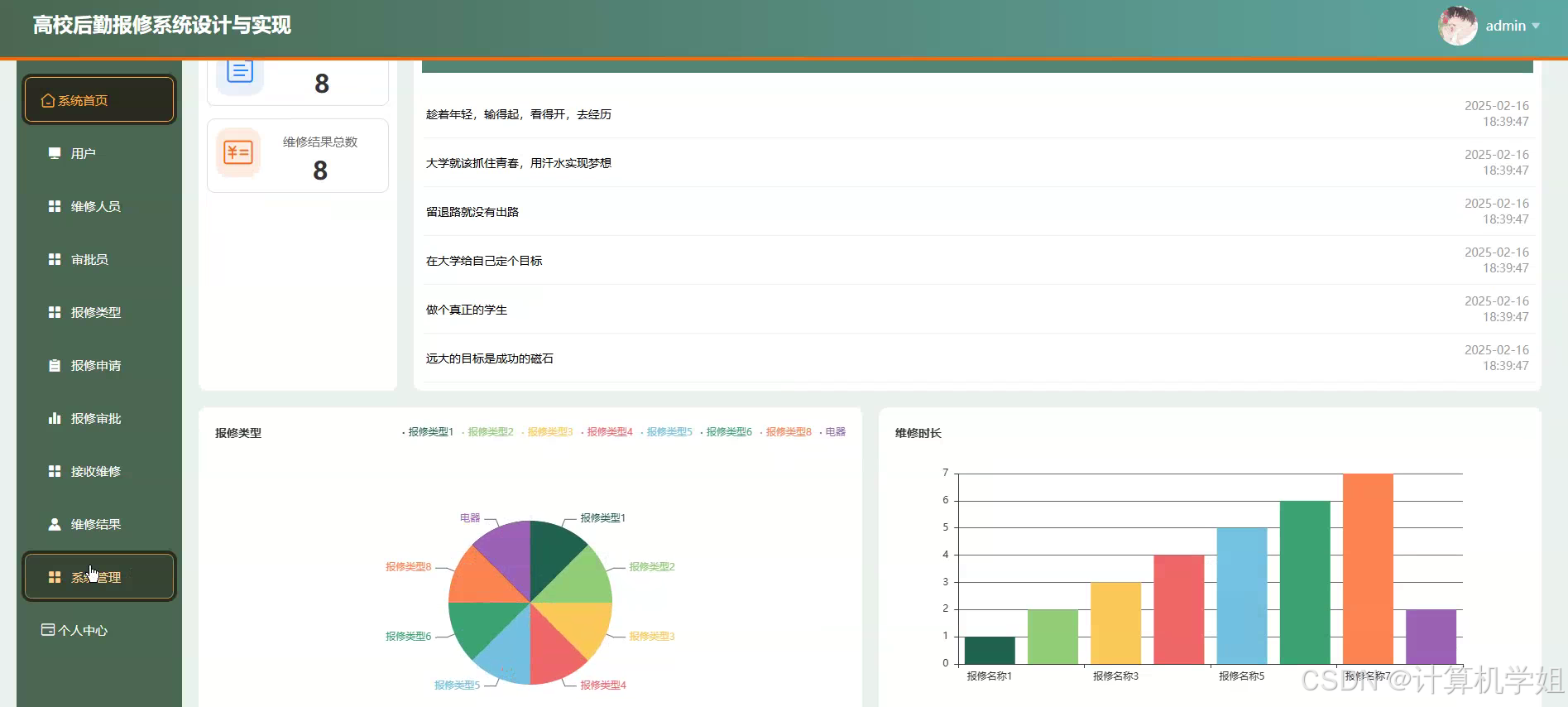 本研究旨在开发一套基于Python+Django+Vue+MySQL的高校后勤报修系统,解决传统报修模式中存在的效率低、流程混乱、信息不透明等核心问题,提升后勤服务响应速度与管理水平。系统通过数字化手段重构报修流程,实现用户在线提交报修申请、后勤人员实时接收工单、管理员动态监控维修进度及师生评价反馈的全流程闭环管理。具体目标包括:一是构建用户友好的交互界面,支持多终端访问,降低操作门槛,提升用户体验;二是设计高效的工单分配算法,根据维修类型、地理位置及人员负载自动匹配最优维修人员,优化资源配置;三是建立实时进度跟踪机制,通过可视化图表与消息推送功能,增强流程透明度,减少沟通成本;四是集成数据统计与分析模块,为后勤部门提供维修频次、响应时间、满意度等关键指标的可视化报表,辅助决策优化。通过本研究,期望为高校后勤管理提供一套低成本、易部署、可扩展的数字化解决方案,推动后勤服务向智能化、精细化方向发展,最终实现提升师生满意度、降低管理成本、增强校园治理能力的综合目标。