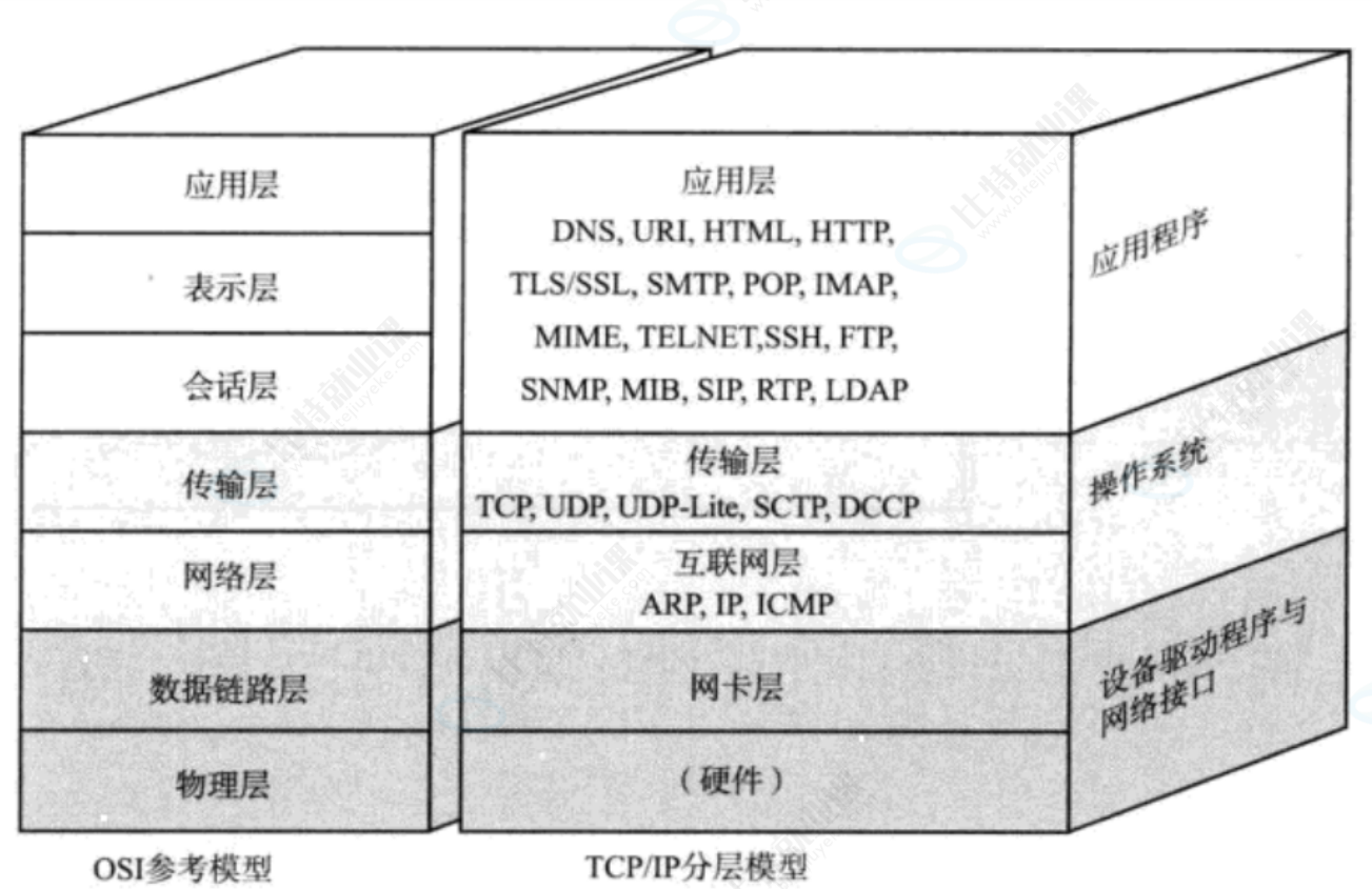 OSI参考模型:物理层,数据链路层,网络层,传输层, 会话层, 表示层, 应用层