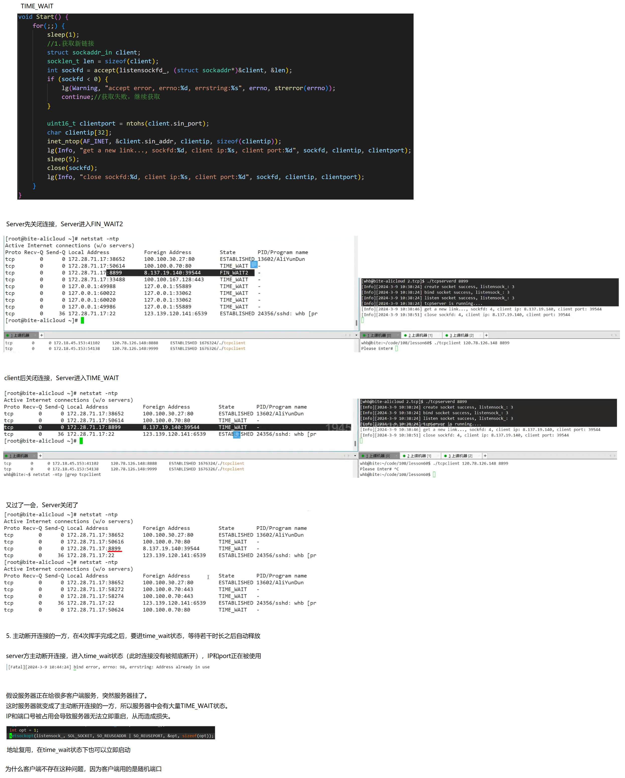 CLOSE_WAIT -\> LAST_ACK\] 进入CLOSE_WAIT后说明服务器准备关闭连接(需要处理完之前的数据);当服务器真正调用close关闭连接时,会向客户端发送FIN,此时服务器进入LAST_ACK状态,等待最后一个ACK到来(这个ACK是客户端确认收到了FIN)