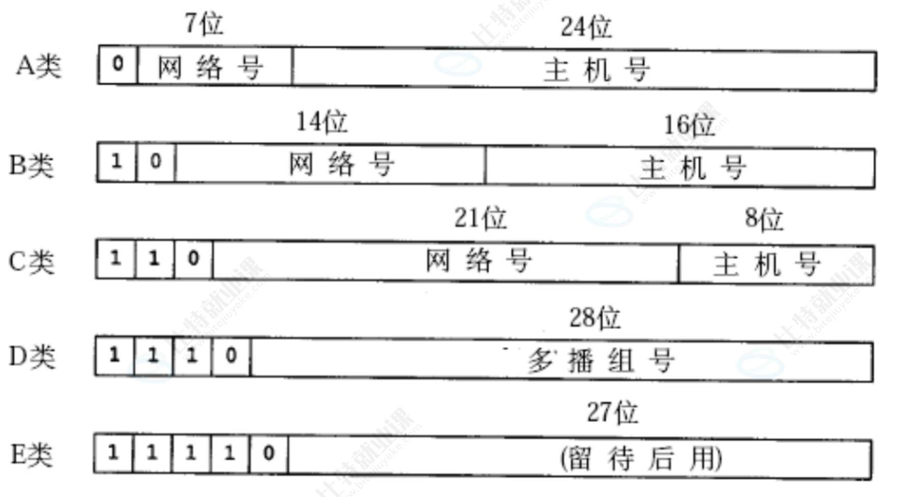 - D类地址:224.0.0.0 ~239.255.255.255,后28位为多播组号