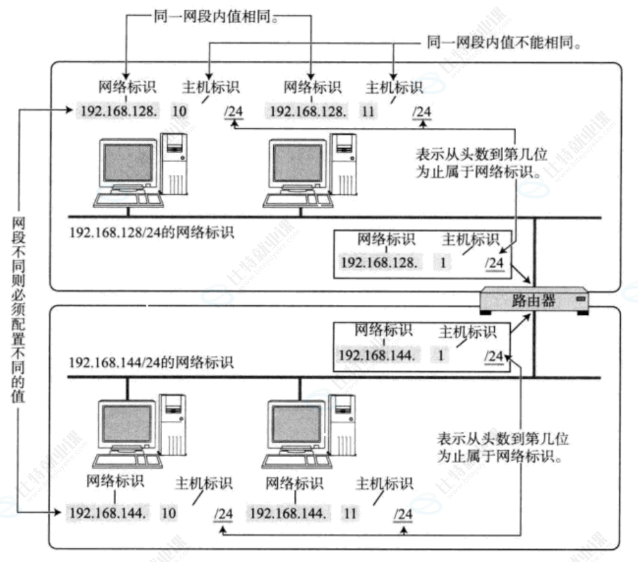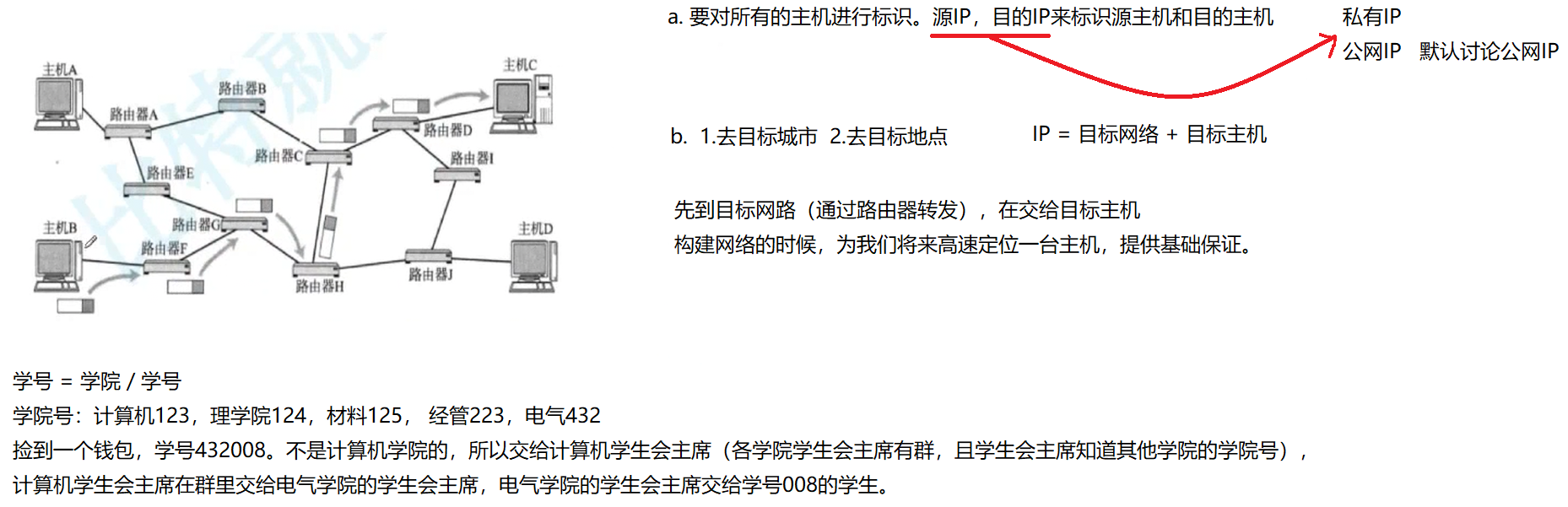 - 一部分是标识自己所属网络的网络号,以便于在网络中寻找指定的子网络,