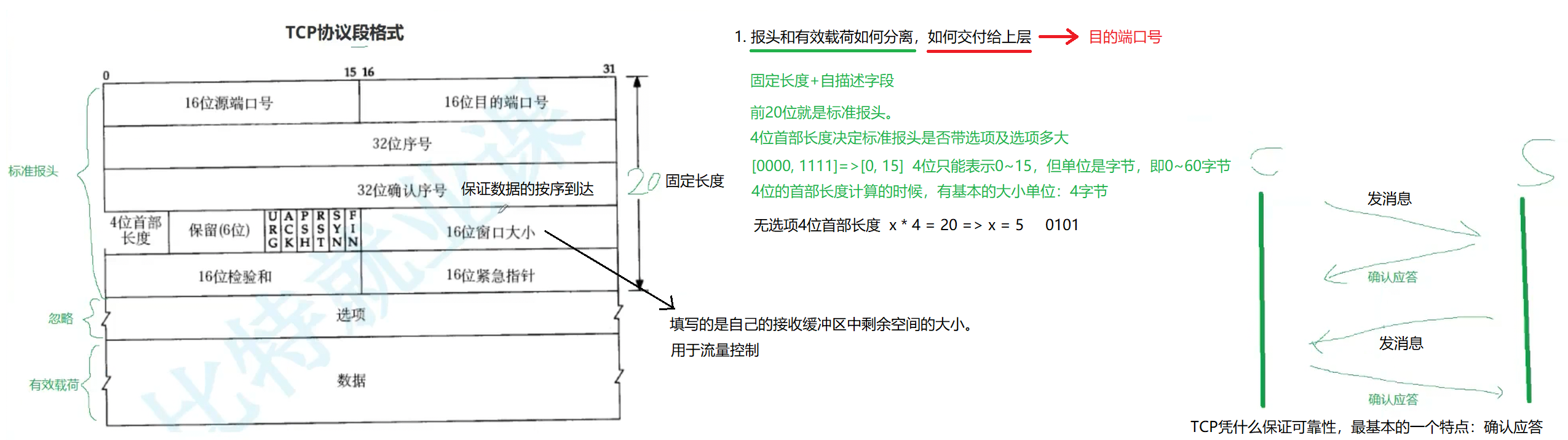 - 4位TCP报头长度:表示该TCP头部有多少个32位bit(有多少个4字节);所以TCP头部最大长度是15 * 4 = 60