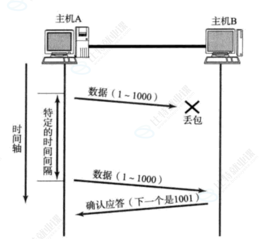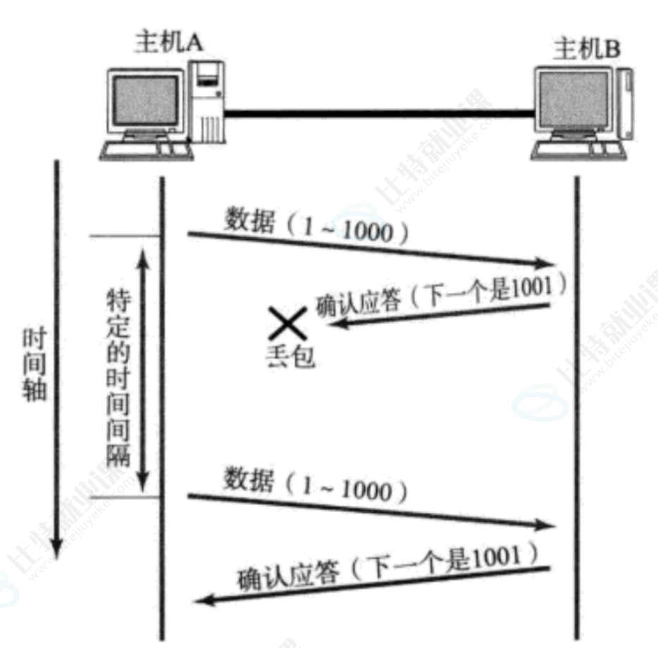 - 如果主机A在一个特定时间间隔内没有收到B发来的确认应答,就会进行重发;