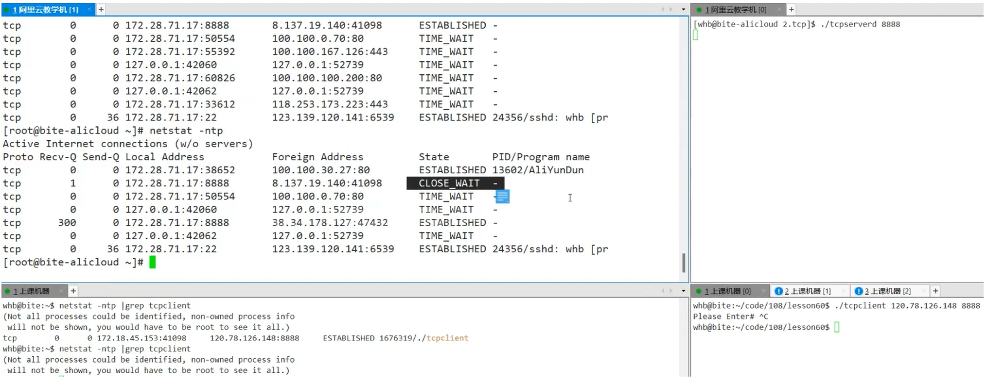 ESTABLISHED -\> FIN_WAIT_1\] 客户端主动调用close时,向服务器发送结束报文段,同时进入FIN_WAIT_1;