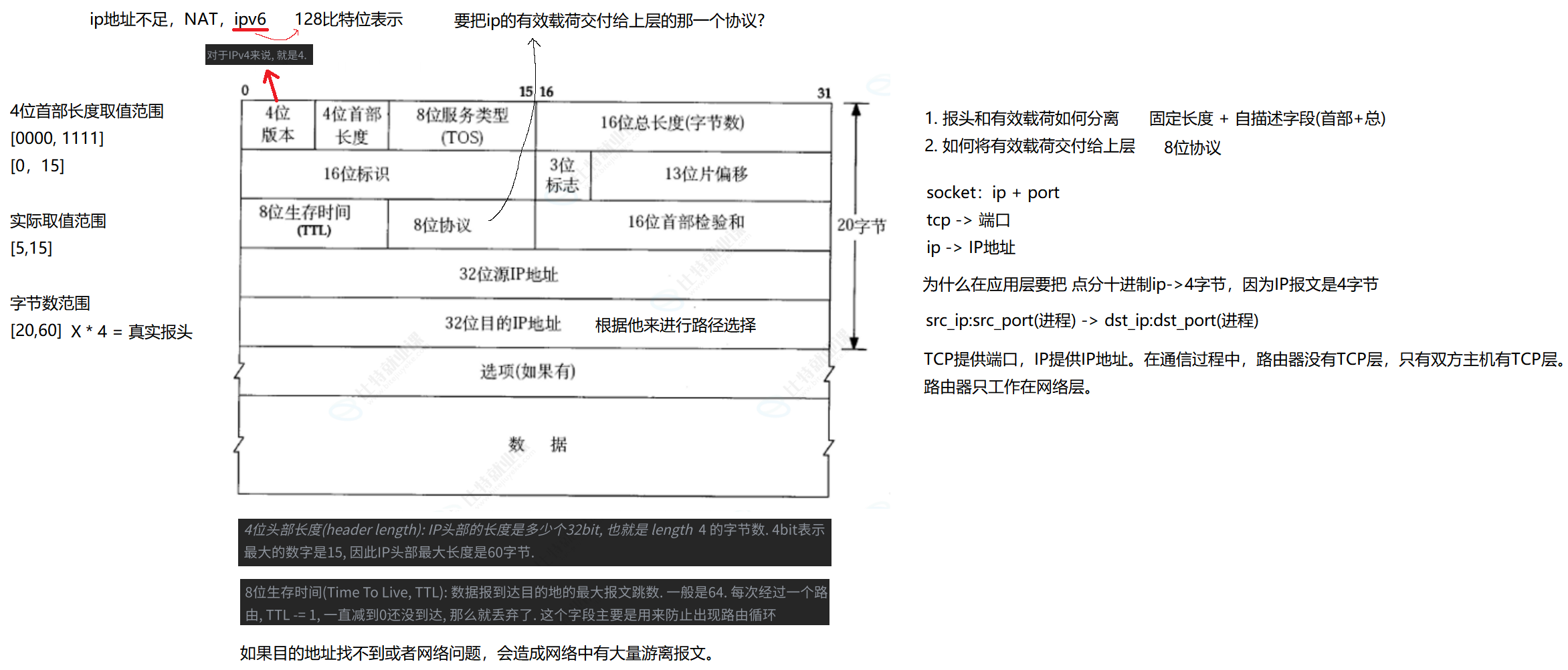 IPv4版的IP地址是无符号四字节大小,共有接近43亿个IP地址,但是IP地址不够用,因此在IPv6中扩大了IP地址范围为16个字节大小(因为并不向前兼容IPv4所以推广较慢)