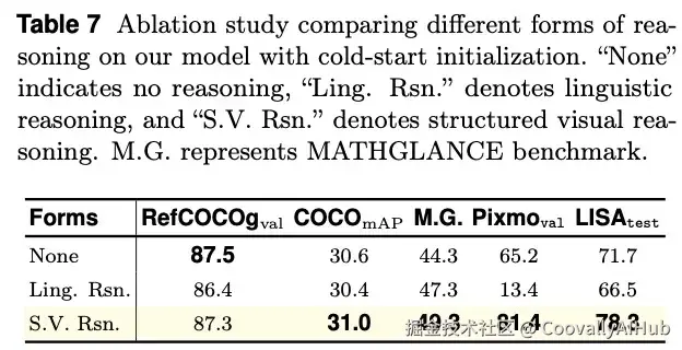 - 纯语言推理: 会干扰感知过程,导致性能下降,尤其在计数等任务上。