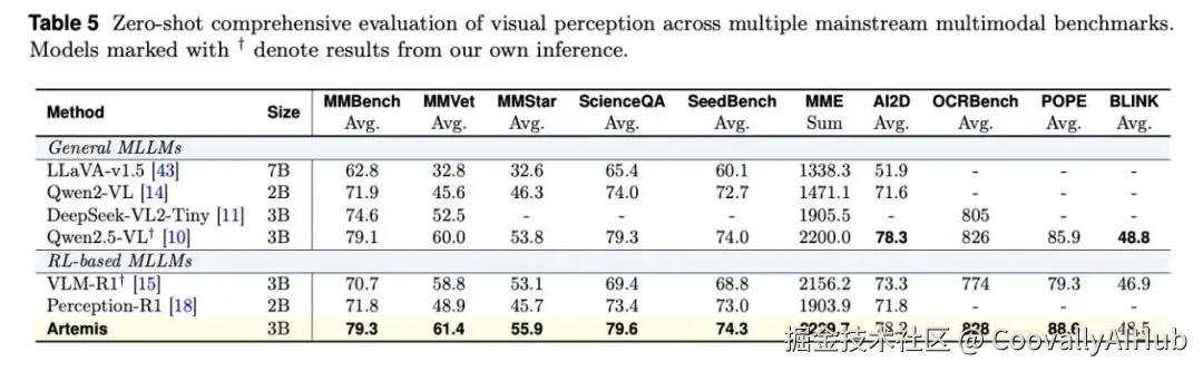 在MMBench、MMVet等主流多模态理解基准测试中,Artemis保持了竞争优势,表明其增强的感知能力有益于整体的多模态推理。