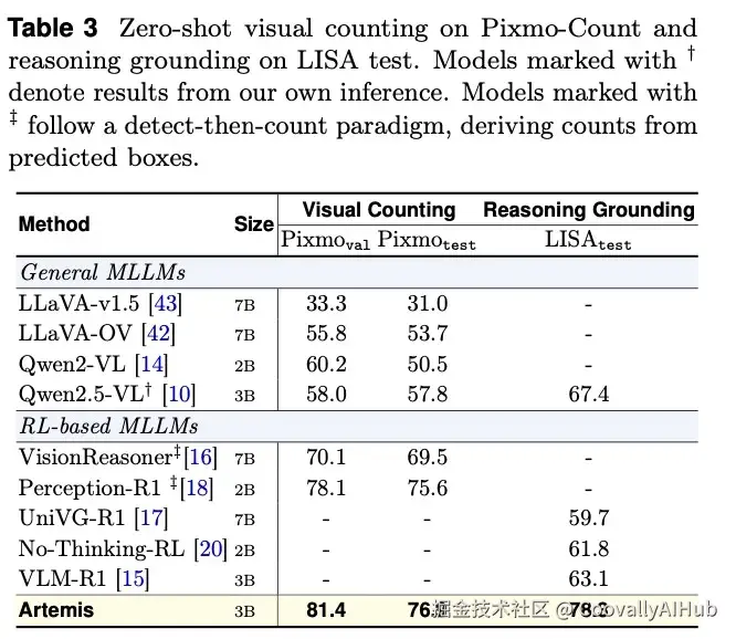 视觉计数: 在从未接受过计数任务训练的情况下,Artemis在Pixmo-Count数据集上的零样本准确率高达81.4,甚至超过了专门为计数设计的模型。它通过结构化地"列举"出图像中的目标对象来完成计数,模仿了人类的点数行为。