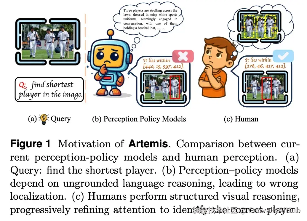 为什么会出现这种现象?来自南京理工大学、新加坡科技设计大学、阿德莱德大学、百度、Data61-CSIRO以及商汤科技的研究团队在最新论文《Artemis: Structured Visual Reasoning for Perception Policy Learning》中给出了深刻的见解。核心问题不在于"推理"本身,而在于"推理的形式"。视觉感知的本质要求在空间和以对象为中心(Object-Centric)的结构化环境中进行推理,而不在非结构化的语言空间中进行"空谈"。