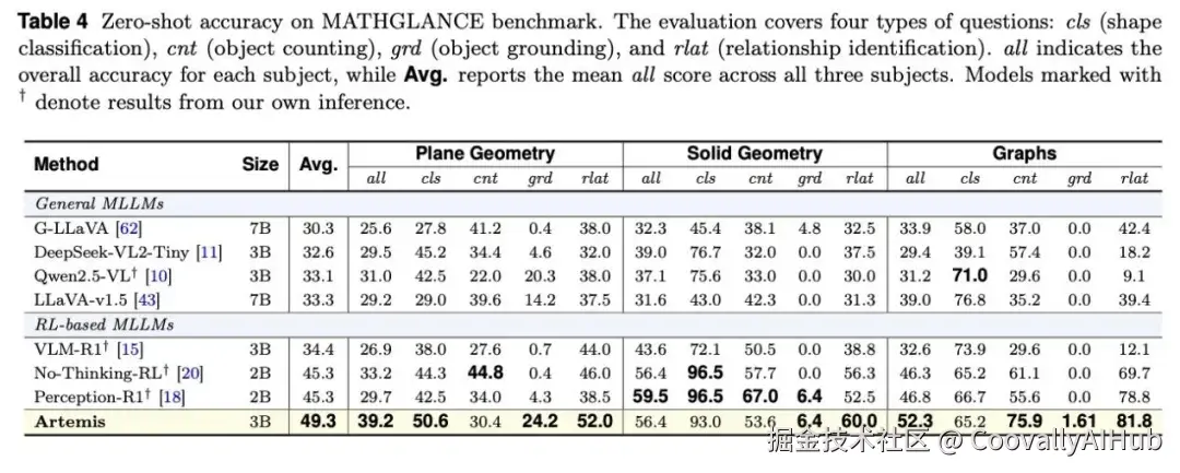 - 几何图形感知: Artemis能够将其在自然图像中学到的结构化感知能力,稳健地迁移到数学几何图形领域。在MATHGLANCE基准测试(涵盖平面几何、立体几何、图表题)中,它同样表现出色,实现了从真实场景到抽象图示的跨域泛化。