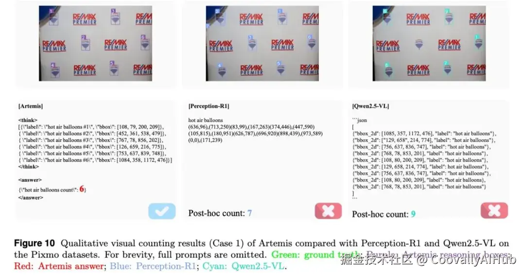 在计数任务中,Artemis 展现了类似人类的"点数"行为,通过逐个标记目标(紫色框)来得出正确的总数,而基座模型 Qwen2.5-VL 则出现了严重的幻觉,标记了大量重复或错误的框。