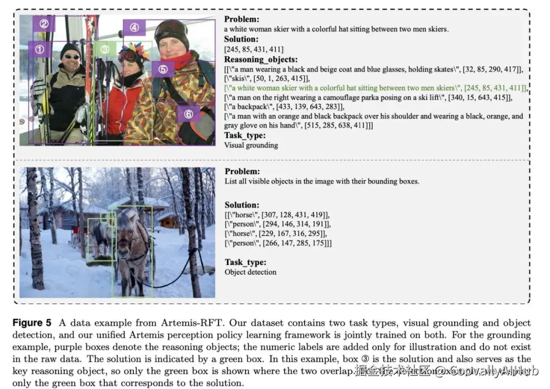 为了训练Artemis,团队构建了Artemis-RFT数据集。该数据集基于MS-COCO构建,包含约7.7万个实例,统一了视觉定位(Visual Grounding)和目标检测(Object Detection) 两种任务格式。模型被训练在给出最终答案(绿色框)之前,先输出中间推理步骤(紫色框)来标识相关对象,从而学会结构化的视觉推理流程。