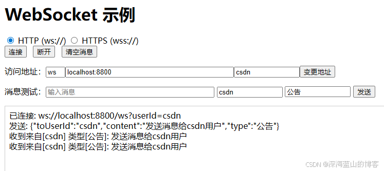 - 提供静态测试页面 index.html ,用于连接、发送消息、查看消息。