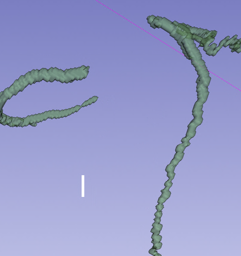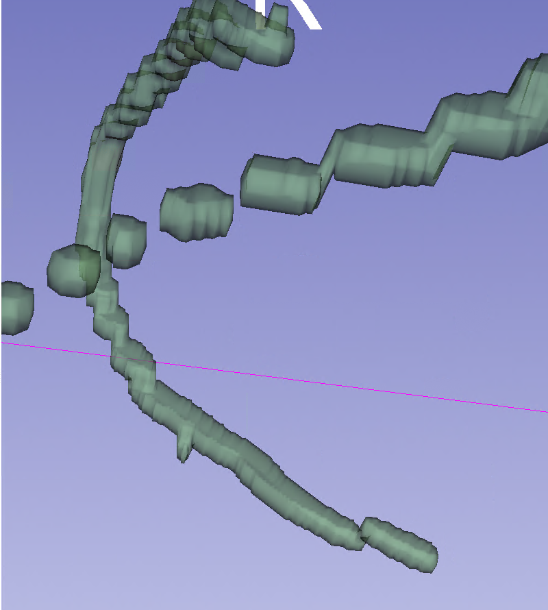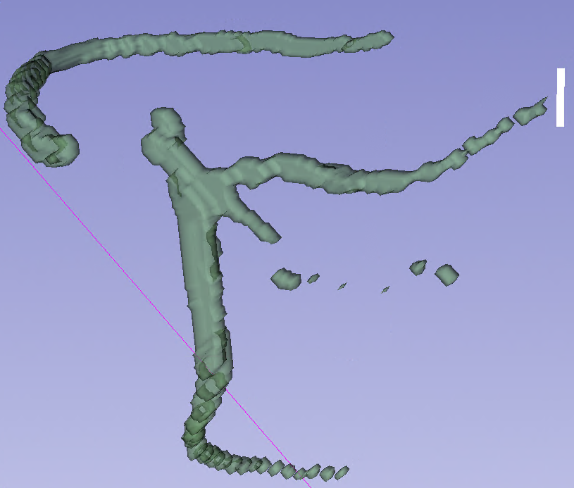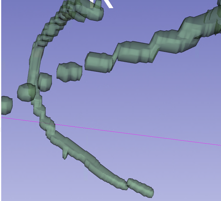 Step 1 膨胀: 20mm 的核确实让血管膨胀,把断层连上了(变成了一根巨粗的柱子)。