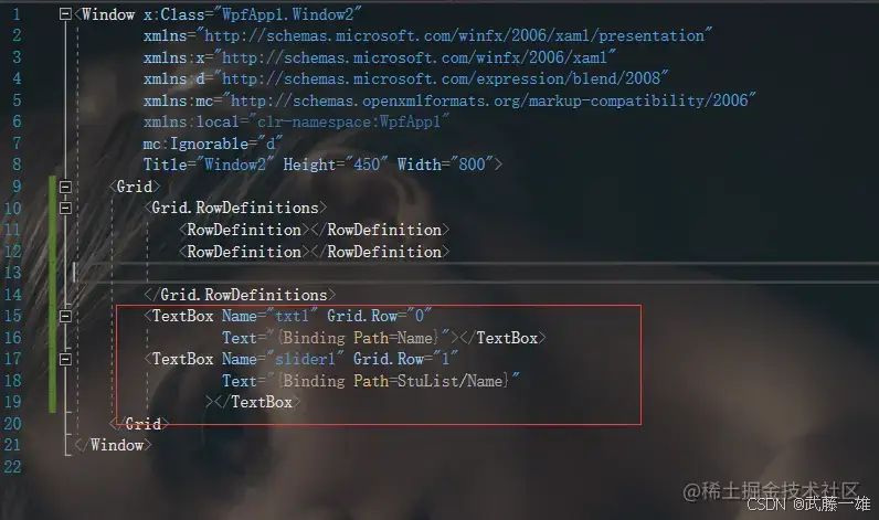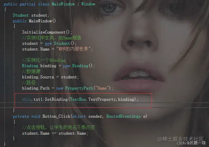 - 应该是为TextBox的属性Text关联(Binding)了一个数据源,可以把这看成一个 Binding的构造函数,相当于初始化Binding
