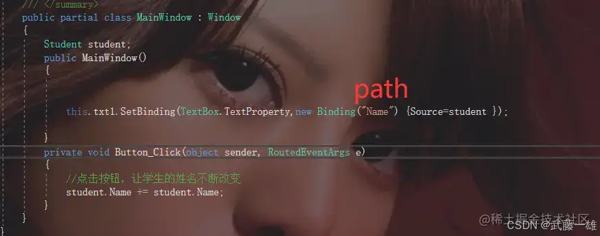 我们需要通往它的道路(Path),Binding的Path是一个PropertyPath类型,参数是一个string。也就是属性的名称(Name)。