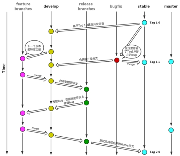 release:release分支可以认为是stable分支的未测试版本。比如说某一期的功能全部开发完成,那么就将develop分支合并到release分支,测试没有问题并且到了发布日期就合并到stable分支,进行发布。