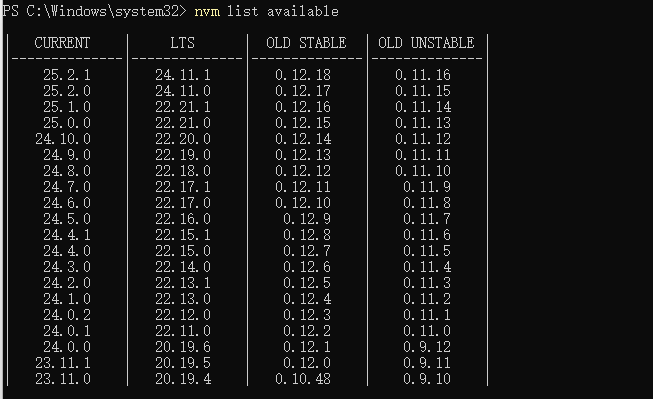这会列出所有官方支持的 LTS 和 Current 版本。