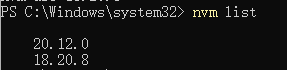 列出本地已安装的所有 Node.js 版本 | 显示: * 20.12.0 (当前) 18.17.0 |