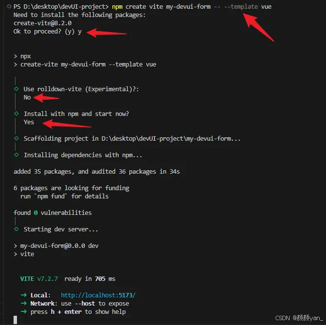 npm create vite- 使用Vite工具创建一个新项目my-devui-form- 项目名称(你可以改成其他名字)--template vue- 使用Vue模板