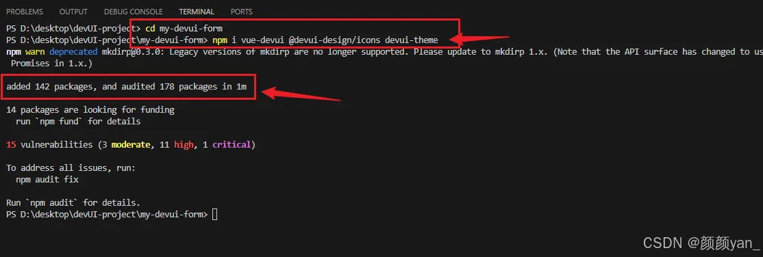 等待安装完成,看到 added XXX packages 就说明成功了。