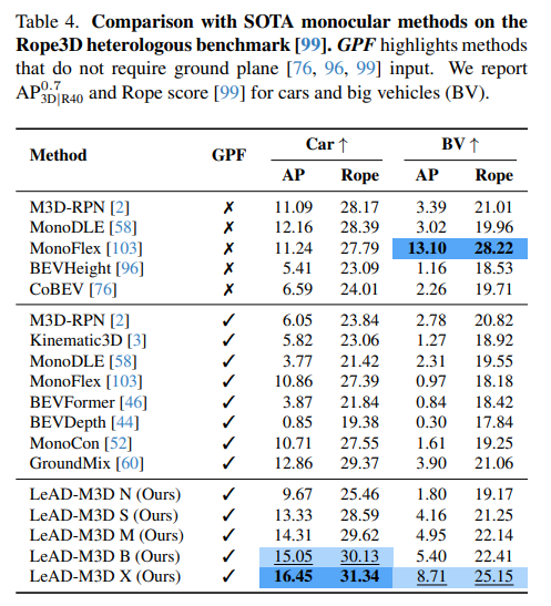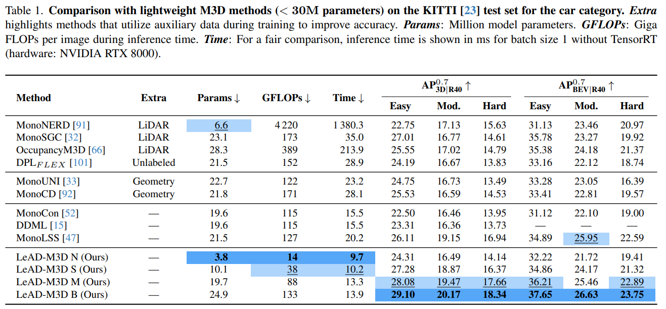 4、展示了 LeAD-M3D 在三个成熟数据集------KITTI、Waymo 和 Rope3D 上的有效性。LeAD-M3D 在所有数据集上都实现了最先进的精度,无需依赖 LiDAR、立体或几何先验,并为准确性与效率权衡开辟了new Pareto frontier