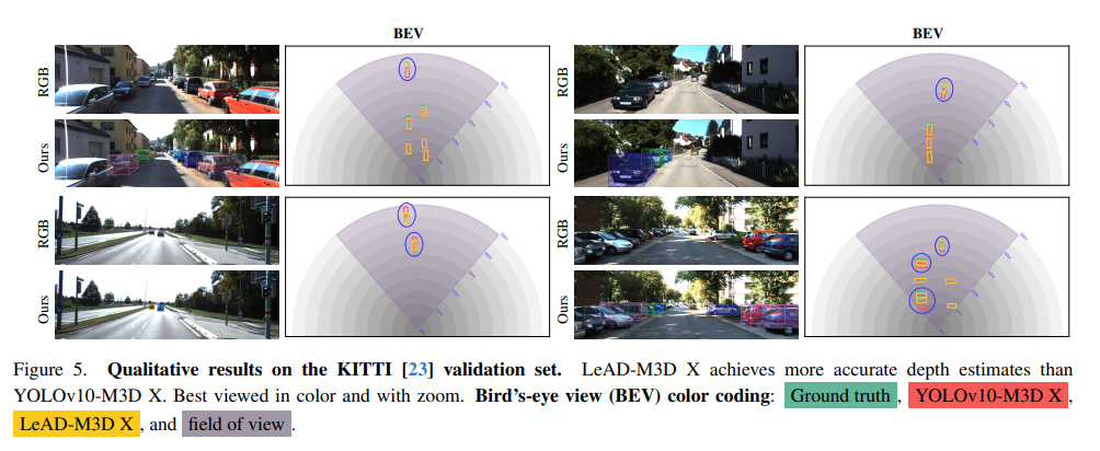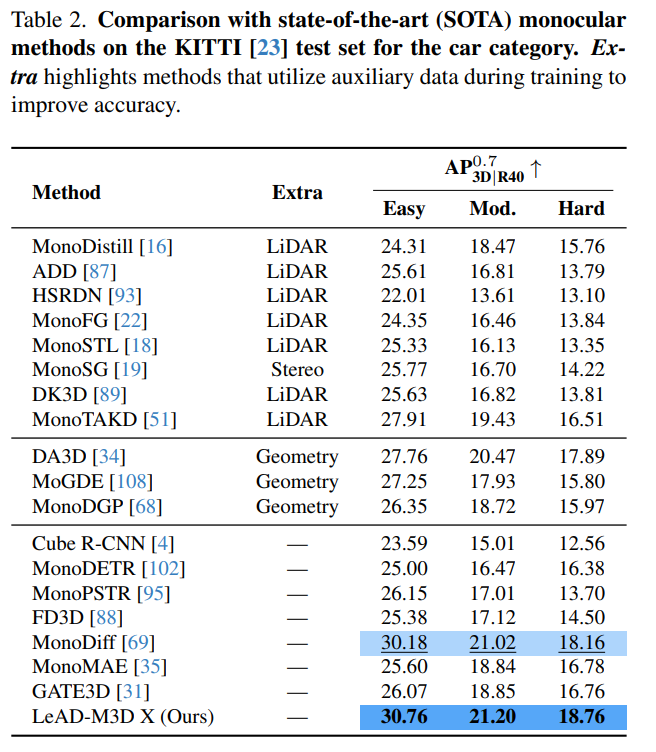 在KITTI测试集上,LeAD-M3D X模型在Car类别上取得了SOTA精度,超越了所有单目方法,甚至包括那些使用LiDAR或几何先验的方法。