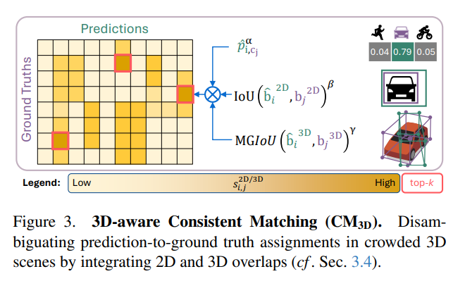 2、引入了3D感知一致匹配(CM3D),一种动态任务比对策略,通过引入 3D MGIoU 项显著提升预测与GT的分配。这通过结合 2D 和 3D 几何质量对齐预测,实现更好的目标定位。