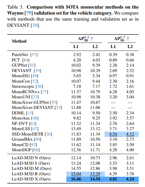 Waymo :在Level 1难度下,LeAD-M3D X的AP3D达到 16.46% ,比之前的最佳模型MonoLSS高出 2.97% 。