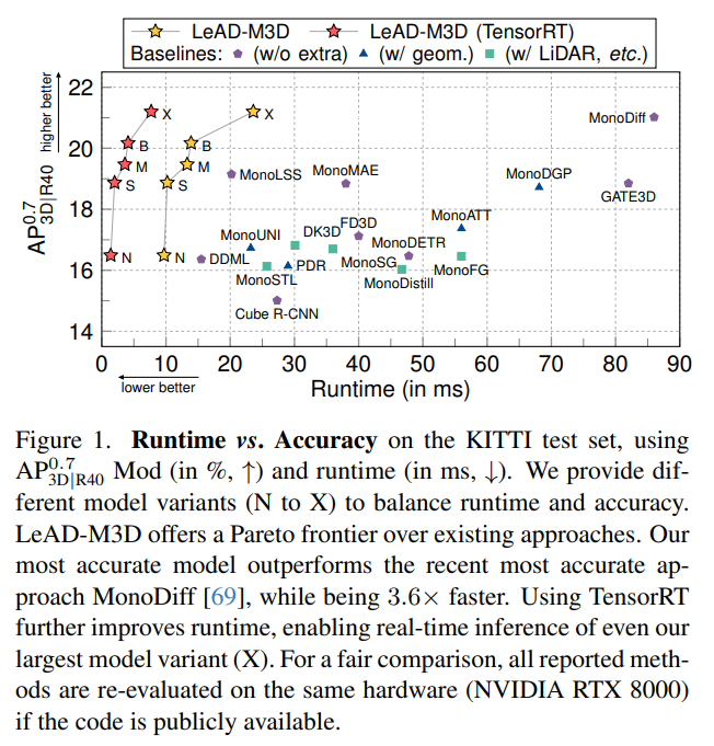 这些组件共同为单目3D 检测开辟了new Pareto frontier:LeAD-M3D 在 KITTI 和 Waymo 上实现了SOTA,在 Rope3D 上实现了最佳汽车 AP,同时比以往高精度方法运行速度更快能达到 3.6倍。结果表明,单目3D 检测的高保真度和实时效率是可以同时实现的------无需依赖 LiDAR、立体或几何假设。