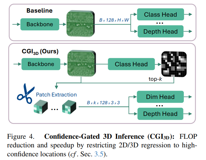 3、提出置信度门控3D推理(CGI3D),一种轻量级推理策略,将昂贵的3D回归限制在高置信度区域。这有效减少了head-level FLOPs,实现实时推理而不降低检测精度。