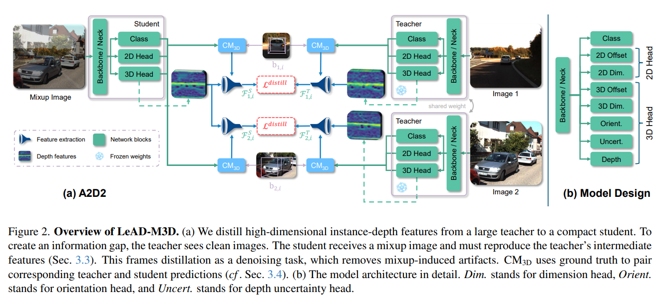 作者的方法由三个关键组成部分驱动。非对称增强去噪蒸馏(Asymmetric Augmentation Denoising Distillation A2D2 )通过质量和重要性加权深度特征损失,将清晰图像上训练的教师网络学习到的几何知识传递给用带有混合噪声图像的学生网络,实现更强的深度推理,无需 LiDAR 监督。3D 感知一致匹配(3D-aware Consistent Matching CM3D )通过将 3D MGIoU 集成到匹配分数中,提升预测与GT的分配,从而实现更稳定和精准的监督。最后,置信度门控3D推理(Confidence Gated 3D Inference CGI3D)通过限制昂贵的 3D 回归到最高置信区,加速检测。
