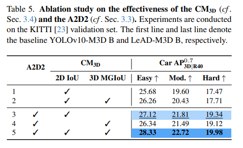 消融实验表明,A2D2模块是性能提升的关键,带来了 +2.29 AP 的增长。而CM3D贡献了 +0.83 AP。这证实了非对称蒸馏策略在提取几何特征方面的有效性